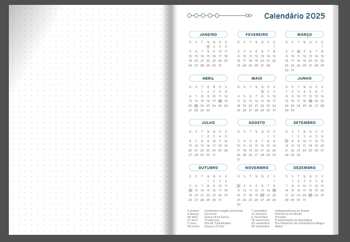 Está procurando por uma forma de organizar seus compromissos e planejar os próximos meses? Você precisa da Agenda 2025. É difícil priorizar o que você tem para fazer quando tudo está emaranhado na sua cabeça. O problema é que a vida não para, e as coisa mudam rapidamente. A Agenda 2025 vem com páginas datadas para rastrear todos os compromissos diários, Sábado e Domingo em uma página, planejamento anual e espaço nos cantinhos das páginas diárias para anotações importantes ou lembretes visuais..