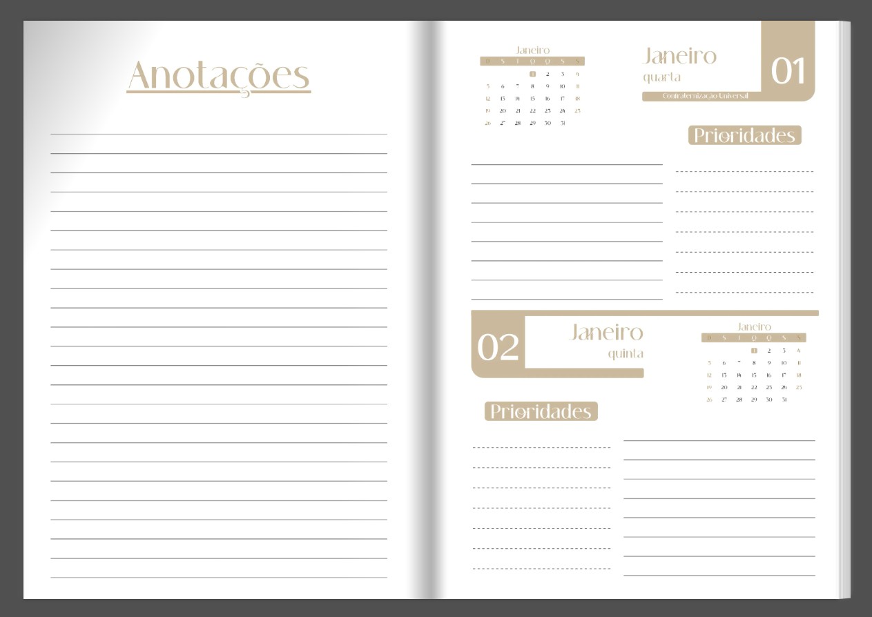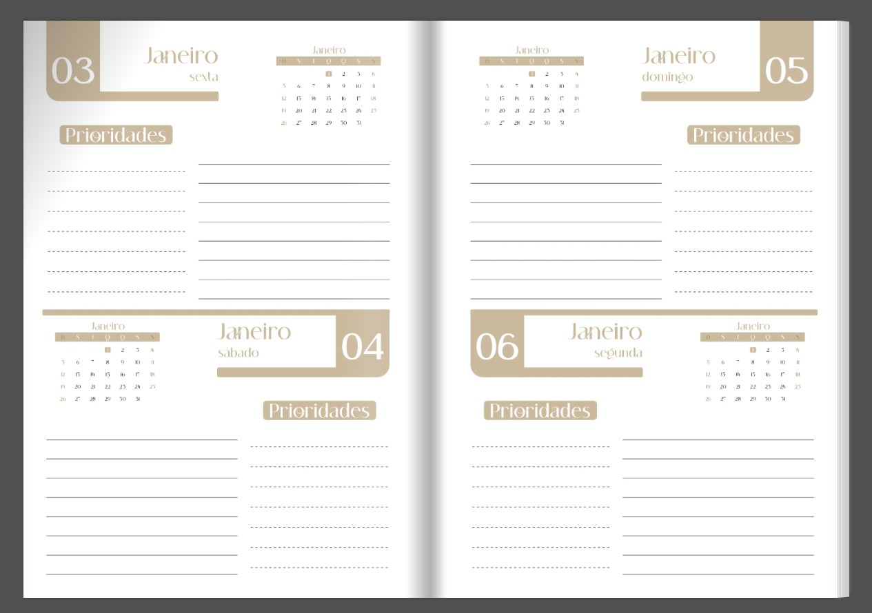 Está procurando por uma forma de organizar seus compromissos e planejar os próximos meses? Você precisa da Agenda 2025. É difícil priorizar o que você tem para fazer quando tudo está emaranhado na sua cabeça. O problema é que a vida não para, e as coisa mudam rapidamente. A Agenda 2025 vem com páginas datadas para rastrear todos os compromissos diários, Sábado e Domingo em uma página, planejamento anual e espaço nos cantinhos das páginas diárias para anotações importantes ou lembretes visuais..