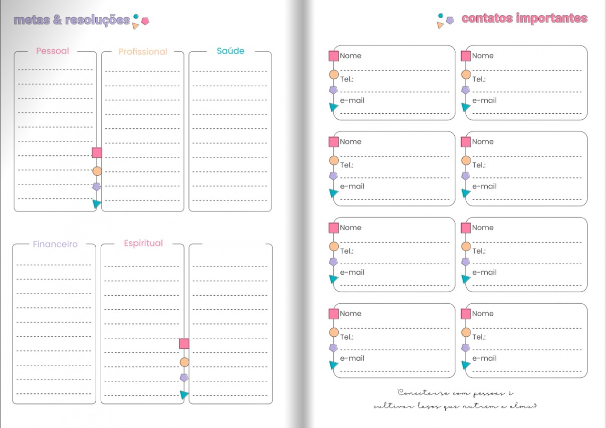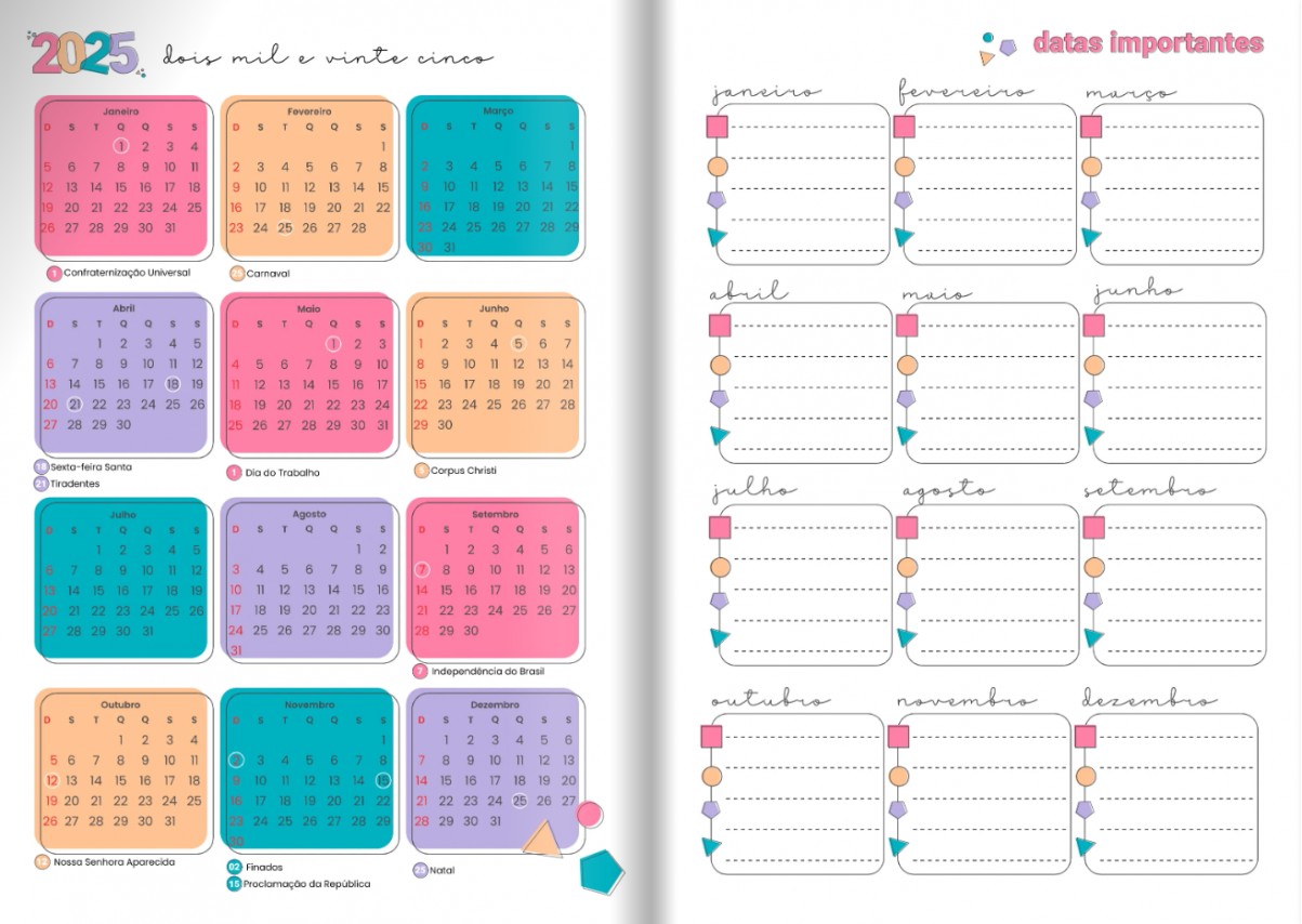 Está procurando por uma forma de organizar seus compromissos e planejar os próximos meses? Você precisa da Agenda 2025. É difícil priorizar o que você tem para fazer quando tudo está emaranhado na sua cabeça. O problema é que a vida não para, e as coisa mudam rapidamente. A Agenda 2025 vem com páginas datadas para rastrear todos os compromissos diários, Sábado e Domingo em uma página, planejamento anual e espaço nos cantinhos das páginas diárias para anotações importantes ou lembretes visuais..