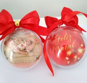 A Bolinha de Natal com Fotos é composto por uma bola de acrílico de 7cm, duas fotos sendo uma virada para um lado e outra para o outro e um lindo laço de fita de cetim.