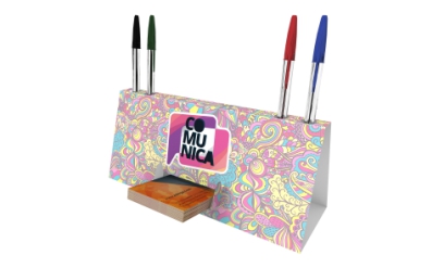 Calendário de Mesa com Porta-Cartões e Canetas, ideal para ambientes corporativos e comerciais, é uma excelente opção de brinde promocional, já que possui três utilidades: Calendário Personalizado, espaço exclusivo para armazenar Cartões de Visita e três compartimentos para Guardar Canetas.