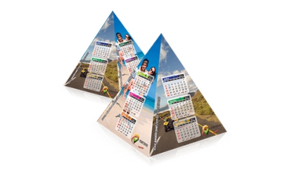 Este modelo de Calendário de Mesa é produzido no Formato de uma Pirâmide, tornando o impresso muito mais criativo e diferenciado. O produto é bastante versátil, podendo ser utilizado de diversas formas, desde brindes promocionais a lembrancinhas de festas e outros eventos.
