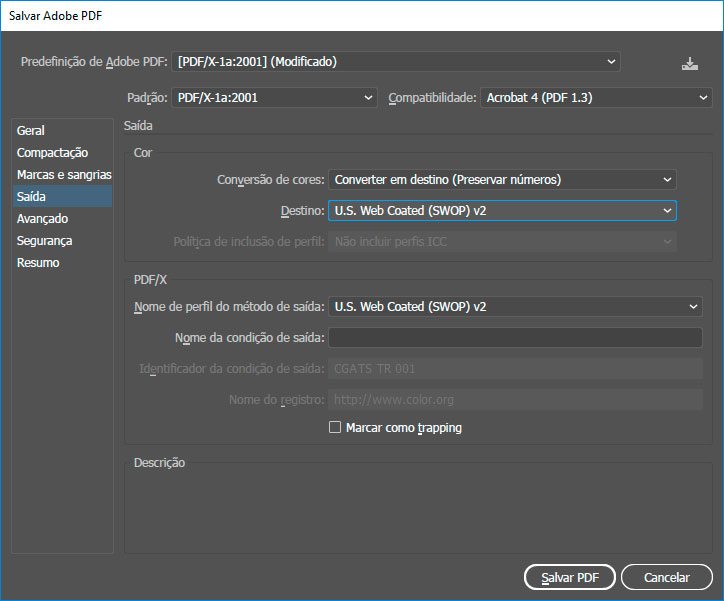 Tenha certeza de que na aba Saída a opção Destino esteja como U.S. Web Coated (SWOP) v2 e em seguida clique em Salvar PDF.