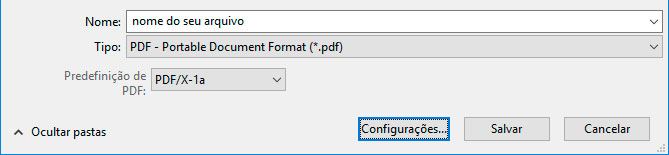 Informe o nome para o seu arquivo e escolha a predefinição PDF/X-1a e clique em Configurações.