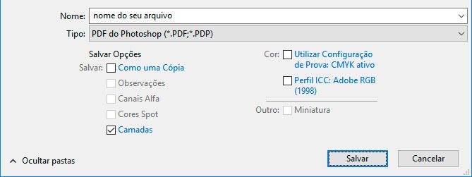 Informe o nome para o seu arquivo e escolha Tipo PDF do Photoshop e clique em Salvar.