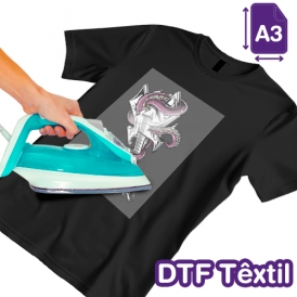 O DTF têxtil é uma impressão direta no filme, com aplicação de tinta branca para dar base em tecidos escuros. A impressão é misturada com a poliamida, que é um termocolante, e levada a um forno para cura. Depois disso o adesivo está pronto para prensar. E o melhor de tudo é que você pode estampar algodão e cores escuras.